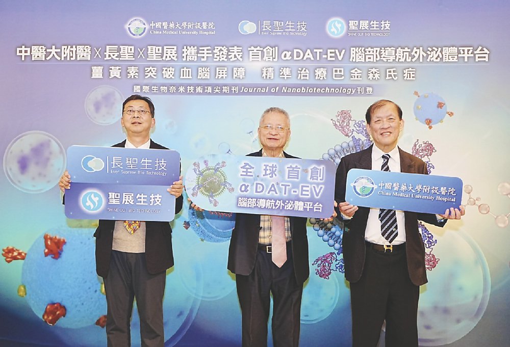 中醫大附醫院長周德陽領軍的研究團隊12日宣布,攜手長聖、聖展生技,在外泌體藥物遞送技術上再創里程碑。這是繼建立實體腫瘤HLA-G標靶外泌體平台後,團隊進一步跨足高門檻的中樞神經系統(CNS)領域,成功開發全球首創具「主動導航」能力的「αDAT-EV 腦部導航外泌體平台」。