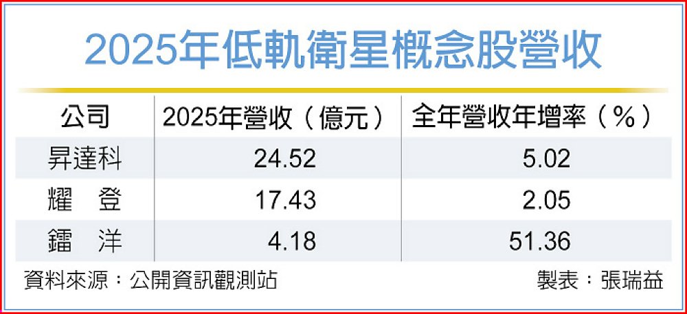 昇達科12月營收3.2億元,創歷史新高,2025年全年營收24.52億元,年成長5.02%,全年營收也創歷史新高。耀登12月營收創單月歷史新高,2025年全年營收17.43億元,年成長2.05%,創全年營收歷史次高。鐳洋2025年全年營收4.18億元,年成長51.36%,同樣創下年度營收歷史次高。三家公司在低軌衛星題材帶動下,2025年已站上新高點,市場亦期待其在2026年續寫成長動能。