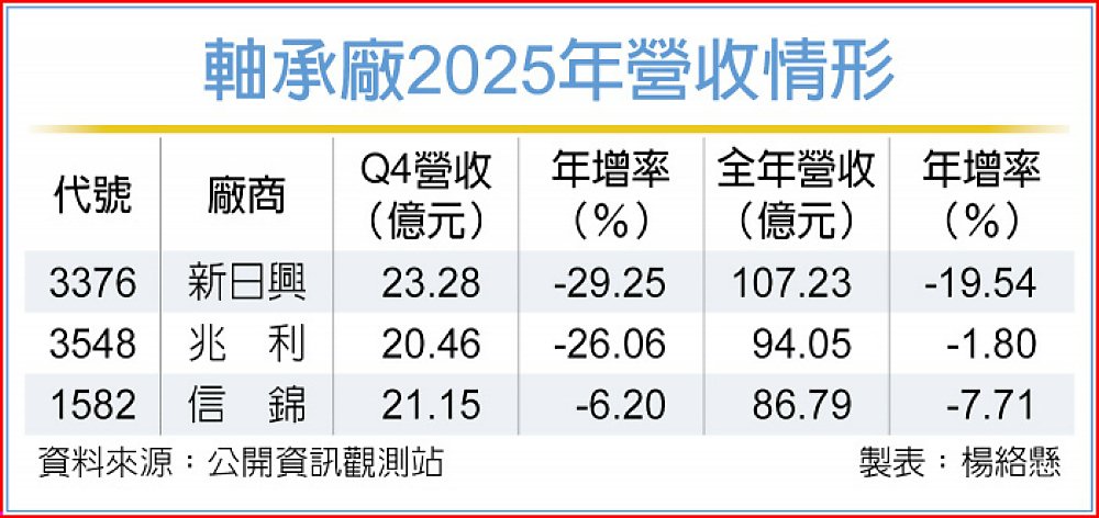 軸承族群公布2025年營收,新日興(3376)、兆利(3548)、信錦(1582)全年營收同步收斂,反映消費性電子需求修正與產品轉換期拉長的共同影響。不過,從營收走勢觀察,各廠已逐步浮現調整節奏,隨筆電、折疊裝置與非消費性應用進入新一輪產品導入期,2026年營運可望因產品放量與新產能銜接而重啟動能。