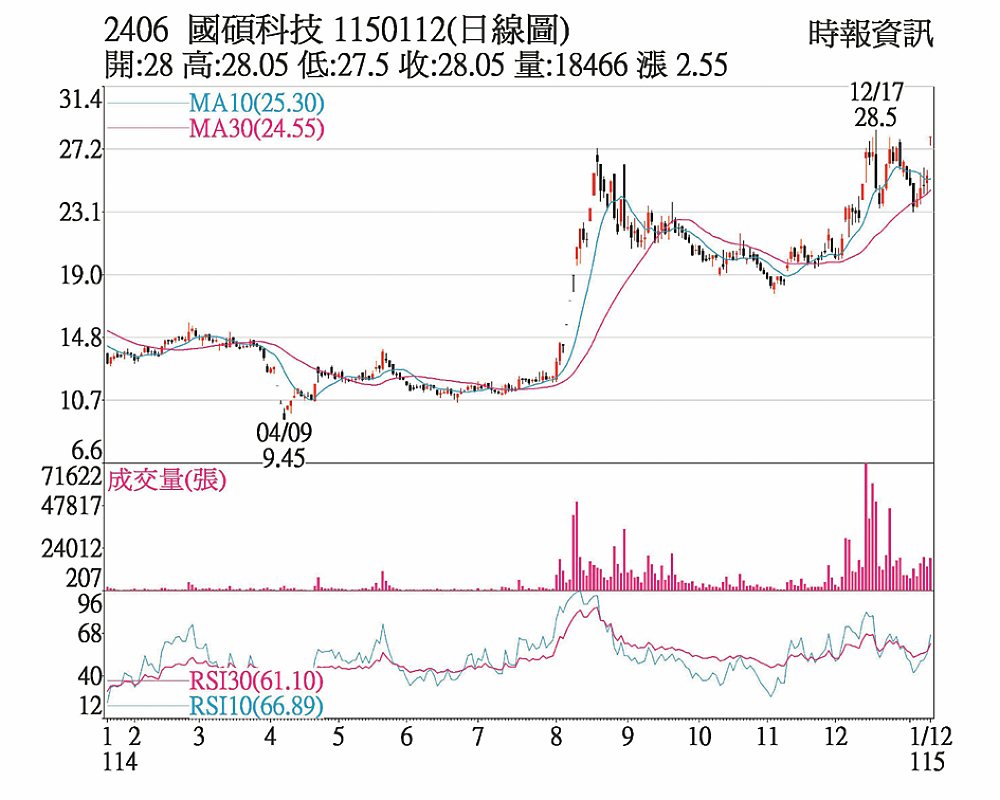 國碩(2406)2025年12營收寫佳績,12日開盤就亮燈漲停鎖死,終場以漲停價28.05元作收,量能擴至1.84萬張。