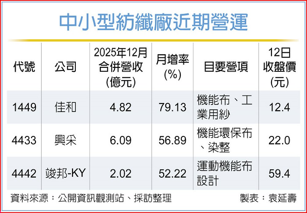 小兵立大功,機能性及工業用紗布廠佳和(1449)、機能環保布廠興采(4433)、運動機能布設計廠竣邦-KY(4442)等中小型紡纖廠「小而美」,2025年12月營收都創近十多年單月新高,甚至歷史單月新高。業者指出,針對客戶打造客製化產品驟效,在產業環境低迷下創造成長空間,預期2026年業績將比2025年成長。