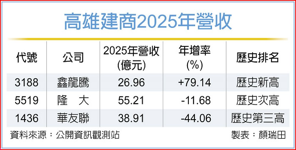 高雄上市櫃建商2025年營收全數出爐,鑫龍騰(3188)因預售案入帳助攻,營收創新高;隆大(5519)、華友聯(1436)也因有預售案交屋,分別站上歷史次高和歷史第三高。