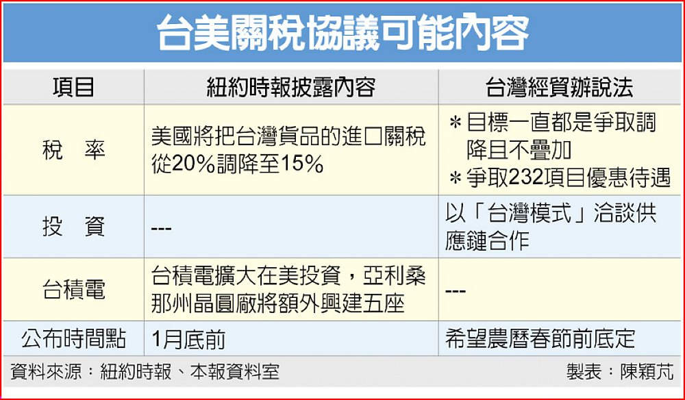 台美關稅談判接近揭曉階段。川普政府傳將與台灣達成貿易協議,美國對台課徵關稅自20%下調至15%,條件是台積電追加對美投資額,目前進入最後談判階段,最快可望於本月對外公布。對此,行政院經貿談判辦公室13日重申,台美關稅談判目標一直都是爭取調降對等關稅且不疊加,及爭取232條款半導體、半導體衍生品及其他232項目的優惠待遇,台美之間針對相關課題已有大致共識,目前正商議總結會議時程。