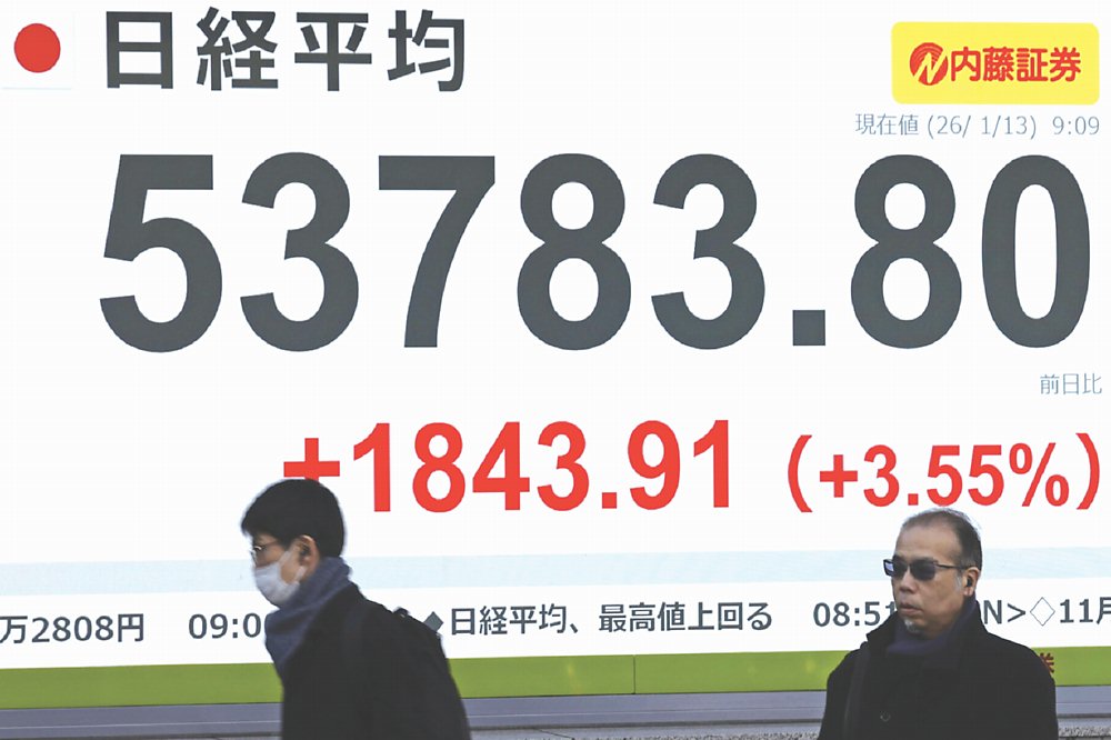 日相高市準備提前大選,加上投資人對AI領域的樂觀情緒激勵晶片股大漲,日經225指數13日早盤一度狂噴近2,000點,漲幅多達3.6%,來到53,814.79點的盤中歷史新高,終場漲1,609點或3.1%,收在53,549.16點,攀抵歷史收盤高點。