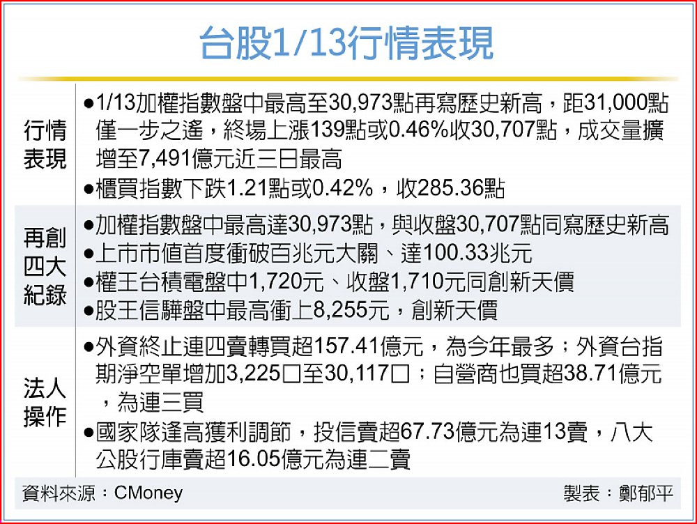 國安基金退場首日造成台股震盪加劇,但通過市場壓力測試後,在台積電股價創新高領軍下,終場加權指數上漲139點收30,707點,與盤中最高30,973點同寫歷史最高紀錄,上市市值首度飆破百兆元大關至100.33兆元,上市櫃市值合計達107.99兆元,再寫新頁。