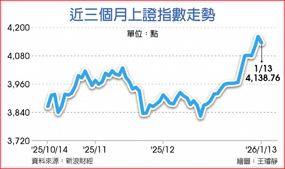 陸股三大指數13日全數收跌。上證指數下跌0.64%,收4,138.76點。深證成指、創業板指數分別跌1.37%、1.96%。雖然指數回檔,但市場氛圍依然亢奮,這已是2026年來連續第三個交易日成交額突破3兆元大關。