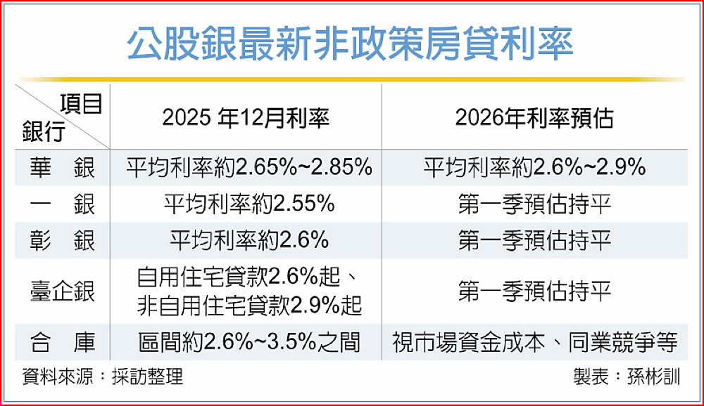 第一銀行統計,2025年12月新承作房貸利率區間為2.45%起,平均利率約2.55%左右,2025年房貸新承作利率呈上升趨勢,但2026年第一季新增房貸利率預估將持平。