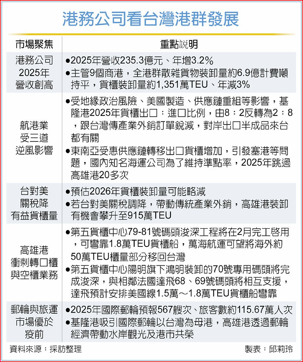 臺灣港務公司2025年營收235.3億元,再創歷年新高,全港群散雜貨物裝卸量約6.9億計費噸持平,唯貨櫃裝卸量約1,351萬TEU(20呎櫃)、年減3%。展望2026年,港務公司預估,若台對美關稅調降,帶動傳統產業外銷,高雄港裝卸有機會攀升到900萬TEU以上。