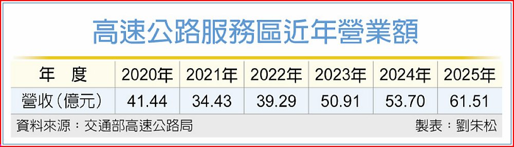 國道高速公路15個服務區2025年營收總和達61.51億元、年增14.54%,創歷年新高,其中統一超商營運的清水服務區在2024年改裝完成後,2025年營收達10.15億元、年增72.9%,再奪高速公路服務區營收龍頭寶座,亞軍為新東陽營運的關西服務區,年營收為6.19億元,