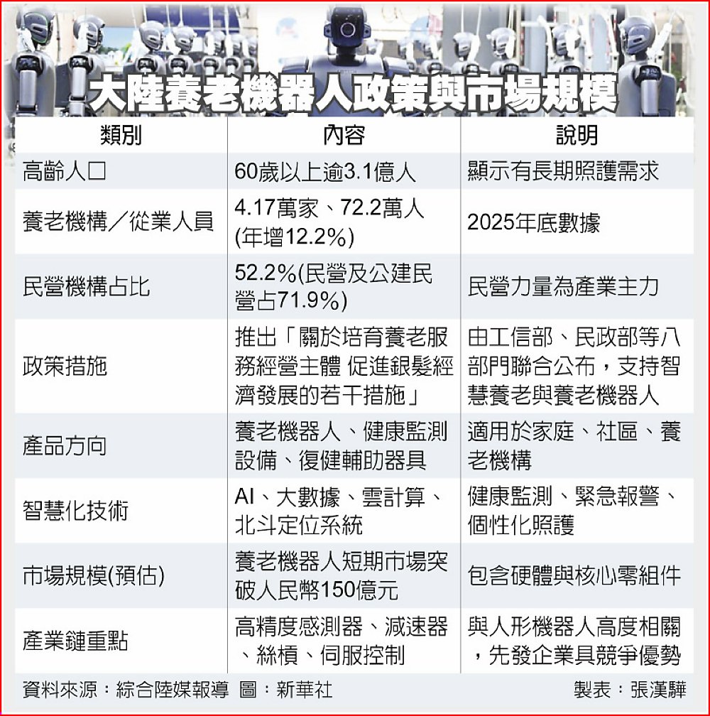 國金證券則估計,在大陸高齡化速度加快下,養老機器人市場短期規模可望突破人民幣150億元,且其硬體與人形機器人高度重疊,將帶動感測器、減速器、精密絲槓與伺服控制等關鍵零組件需求同步成長。