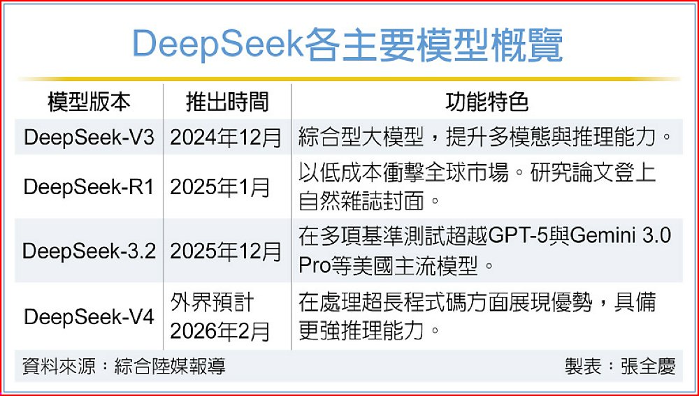 美國科技媒體The Information引述知情人士的報導,DeepSeek將於2月公布其最新旗艦模型DeepSeek-V4。該人士稱,在內部基準測試中已超越Anthropic Claude與OpenAI GPT等西方主流模型,尤其在處理超長程式碼方面展現顯著優勢,V4模型的回答將更具條理性與邏輯性,顯示其推理能力獲得強化。