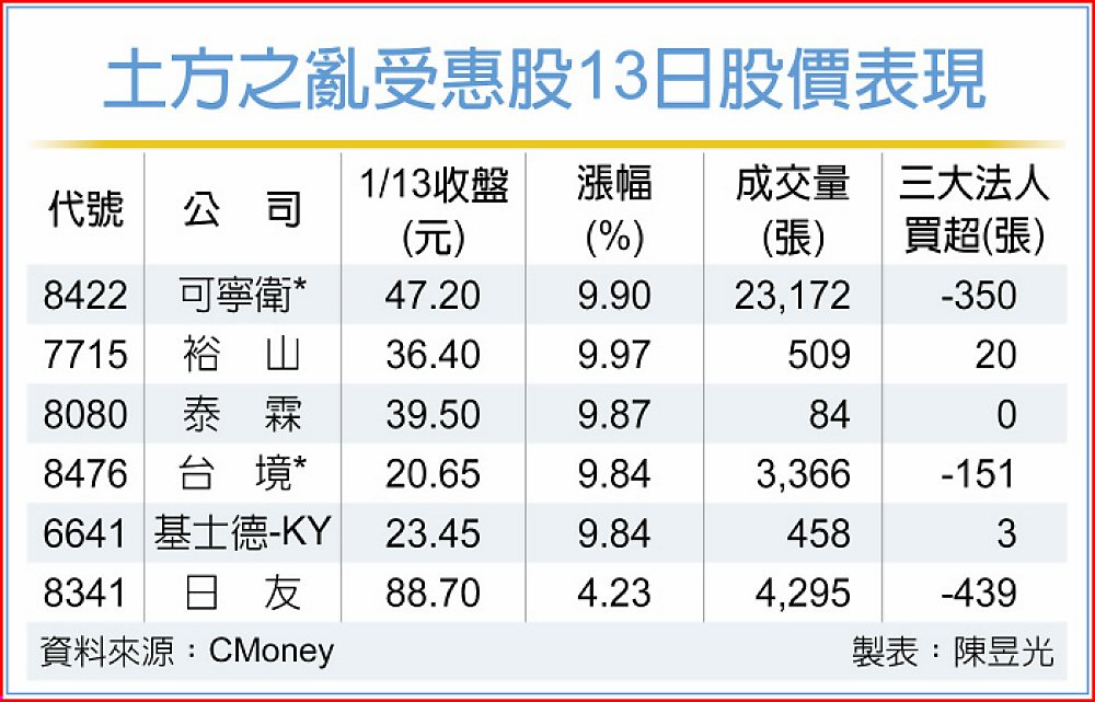土方管理新制上路,使得處理費大幅提升,造就「土方之亂」現象,帶動可寧衛(8422)、泰霖(8080)等5檔相關受惠股強勢吸金,13日同步亮燈漲停,亮「五燈獎」。法人分析,政策立法管理執行預料不會有所更動,將關注至政府是否提出緩衝方案,使得處理費漲勢告終,建議關注消息面及搭配技術面短打操作。