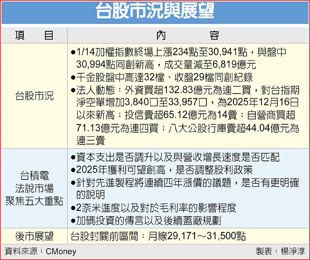 法人認為,市場對台積電15日的法說會將鎖定在美投資金額、先進製程是否有新的布局與台灣能否維持領先,及資本支出、漲價議題等必考題,若展望優於預期,將引領台股突破31,000點,使得元月達成單月內飛越29,000、30,000、31,000點「連破三關」的新里程碑。