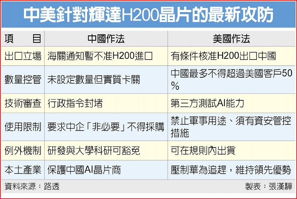 輝達H200晶片輸出中國,因中美兩國的政策攻防而頻傳變數。美國川普政府13日正式宣布有條件核准輝達H200晶片出口中國之際,同時傳出中國海關同步通知報關業者暫不准其進口,官員要求本土科技公司「非必要」不得採購。市場解讀,H200正快速從商用運算產品,升級為中美科技產業博弈的核心籌碼。