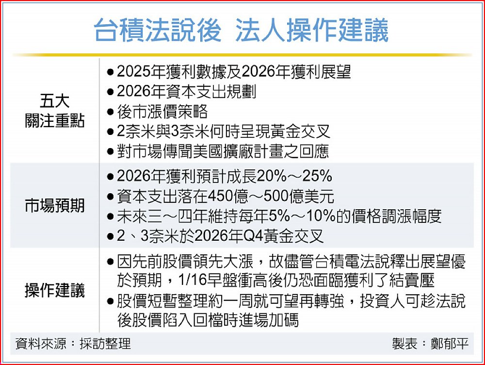 富邦投顧董事長陳奕光、華南投顧董事長呂仁傑、國泰證期顧問處經理蔡明翰分析,市場對台積電15日法說會關注五大重點,包括2025年獲利數據及2026年獲利展望、2026年資本支出規劃、未來幾年漲價策略、2奈米與3奈米何時呈現黃金交叉及市場傳聞的美國擴廠相關計畫。
