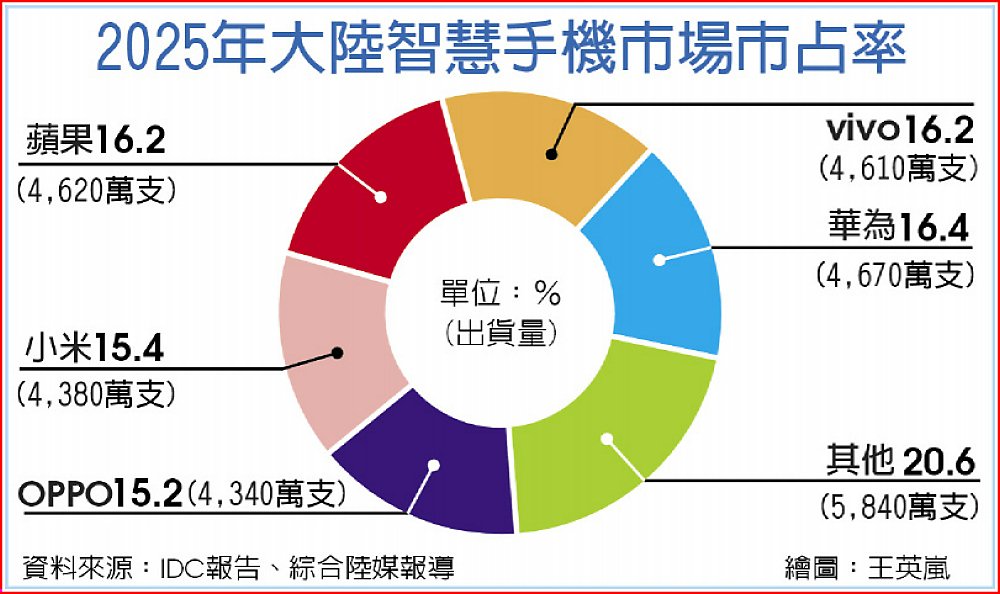 國際調研機構IDC於14日公布最新報告,大陸2025年的智慧手機市場中,華為全年出貨量達4,670萬支,以16.4%的市占率重返第一,這是華為自2020年後重奪回冠軍。蘋果與vivo則分居其後,分別為4,620萬支與4,610萬支,市占率均為16.2%。