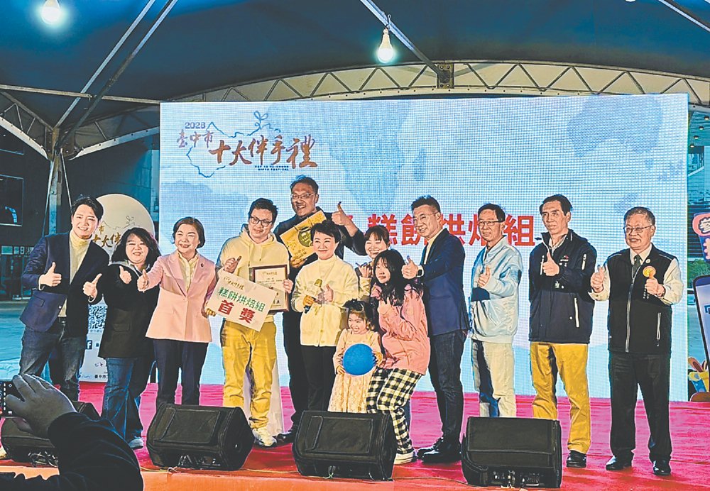 台中市市長盧秀燕(前排左五)親自頒發「2026台中十大伴手禮首獎」給3點1刻數位行銷部經理劉晏通(前排左四),並與3點1刻同仁及貴賓合影。圖/3點1刻提供