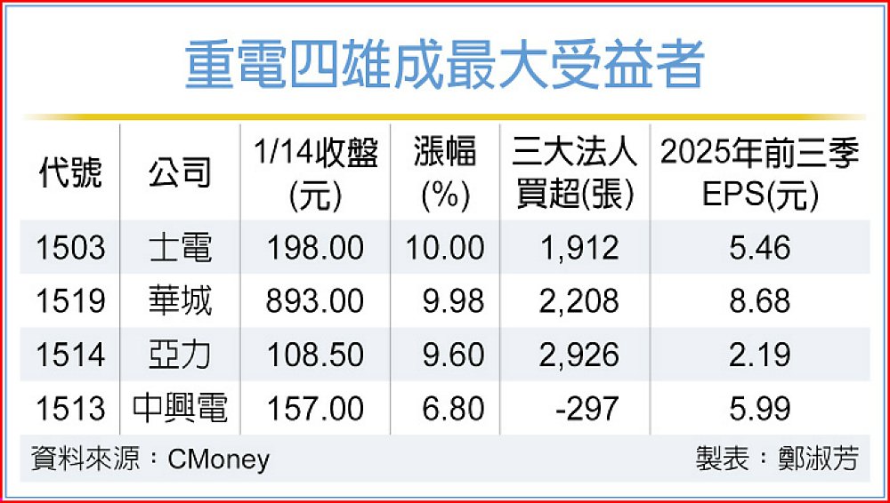 美國對台關稅再傳髮夾彎,傳美方鬆口有望降至15%且不疊加,之前因關稅被打落地獄的重電族群敗部復活,挾著去年營收連袂創下歷史新高的利多夾帶關稅喜訊,重電四雄包括華城(1519)、士電(1503)、亞力(1514)攻上漲停,中興電(1513)雖未亮燈,但漲幅亦達6.8%,順利重返人生勝利組。