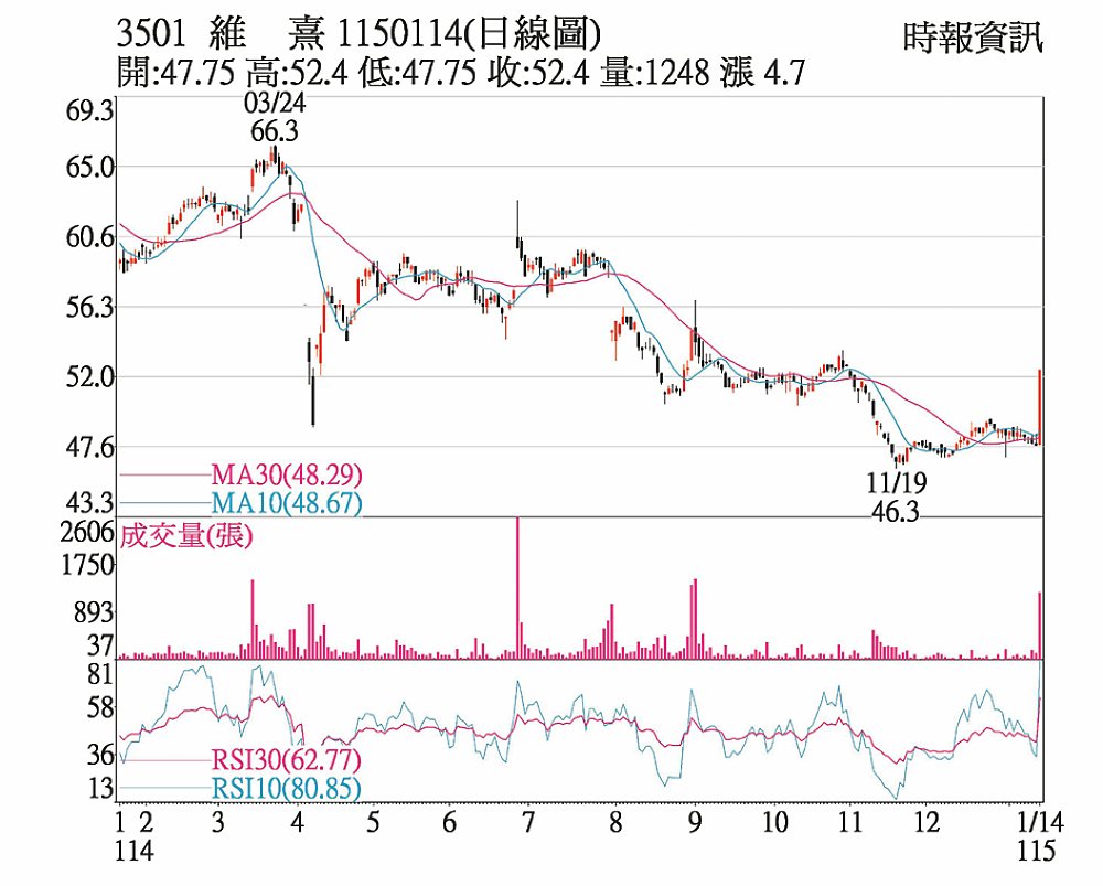 維熹(3501)股價位階仍低,在特定買盤介入之下,股價強攻漲停板,並一路鎖死至終場,收盤價52.4元,創2025年11月4日以來新高價位,日K終結連四黑,拉出巨量長紅K棒,技術線型呈現KD低檔交叉向上,有利於多頭格局。