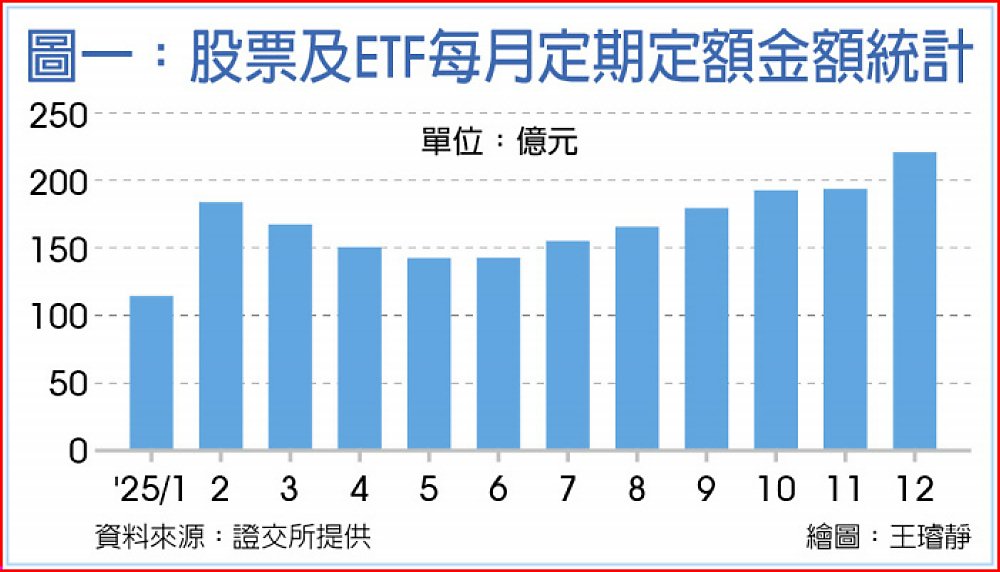 證交所統計,推動證券商開辦定期定額業務至今已邁入第十年,截至114年12月止,定期定額投資股票及ETF之累積金額近6,000億元,呈現穩定成長趨勢(圖一),114年月均扣款金額較113年成長約25%。