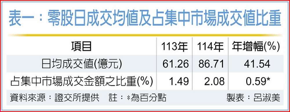 在零股交易方面,114年零股交易日均成交值達86.71億元,占集中市場日均值比率約2.08%(表一),與盤中零股實施前相較,成交值年增0.59個百分點,占比亦大幅上升。
