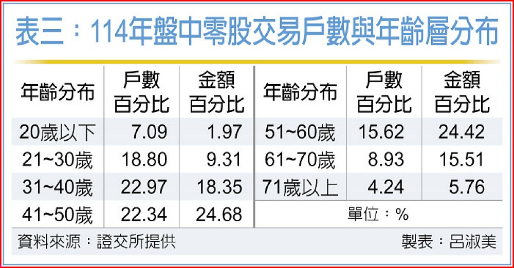 證交所觀察,114年參與定期定額投資的族群(表二),主要集中21~50歲的青壯年族群,總計占定期定額人數逾5成,反映年輕世代已經具備投資理財觀念,並能及早準備長期投資規劃。