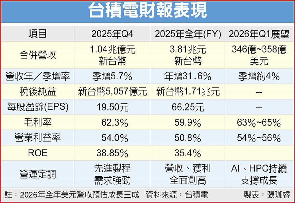 受惠N3、N5等先進製程需求持續暢旺,加上AI相關應用快速放量,台積電2026年營運動能持續轉強。公司預期,第一季美元合併營收將達346億~358億美元,約新台幣1.09兆~1.13兆元,季增約4%,毛利率可望一舉站上63%~65%。今年台積電以美元計營收成長率可望接近30%。