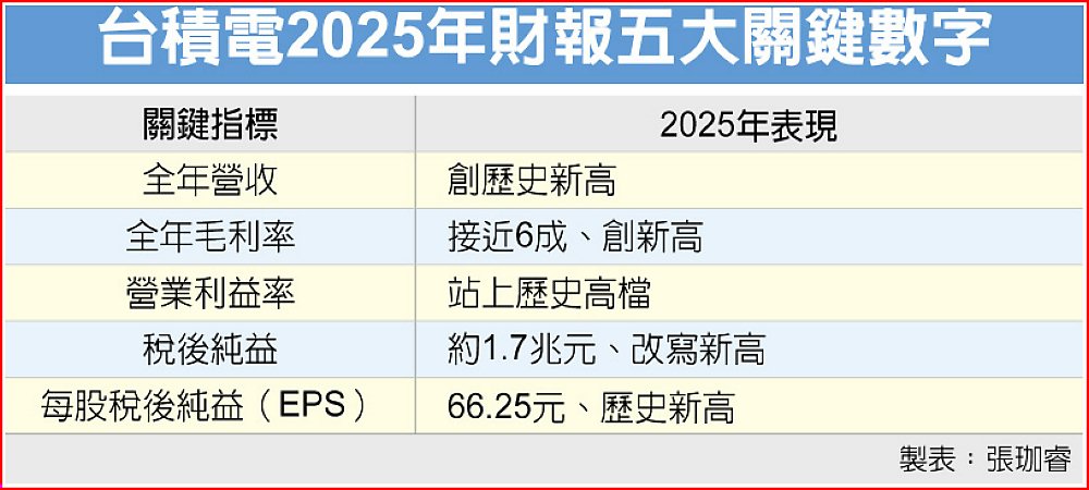晶圓代工龍頭台積電2025年第四季毛利率衝上62.3%、創新高,全年稅後純益1.71兆元、每股EPS 66.25元同締新猷。台積電董事長魏哲家15日直言「AI是真的(AI is real)」,並定調2026年半導體供需仍將持續吃緊,同時拋出史上最強投資訊號,資本支出上看560億美元,宣示台積電在AI與先進製程競逐中火力全開。