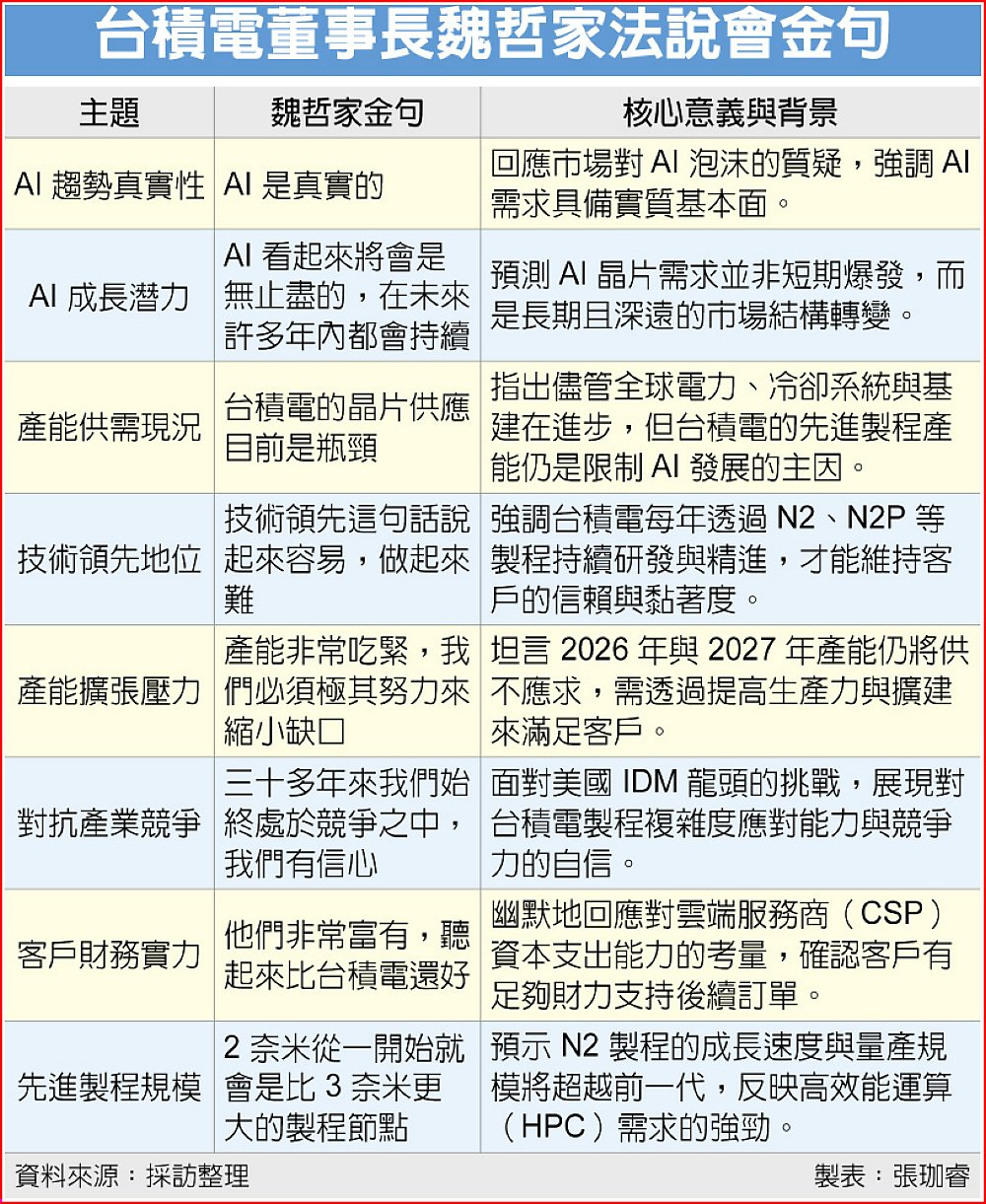 魏哲家昨日在法說會中也幽默分享,過去幾個月,他親自與客戶及「客戶的客戶」深度溝通,發現這些CSP(雲端服務供應商)不僅清楚AI如何實質推動業務成長,也已確保穩健的財務回報。他更笑稱,自己特別確認過客戶的財務狀況,「他們非常富有(Very rich),聽起來比台積電還有錢」,因此對需求前景毫無疑問。