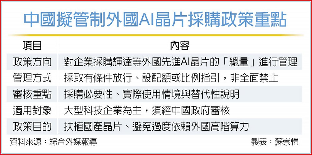 美國政府13日才剛對輝達AI晶片H200銷往中國開綠燈,14日卻傳出中國海關禁止H200進口。但外媒15日披露,中國政府其實正在研擬採購新規,計畫管控國內企業購買外國AI晶片的總量,採取「有條件放行」的方式,而非全面禁止外國晶片進口,藉此在因應高階運算需求與扶植本土半導體產業之間取得平衡。