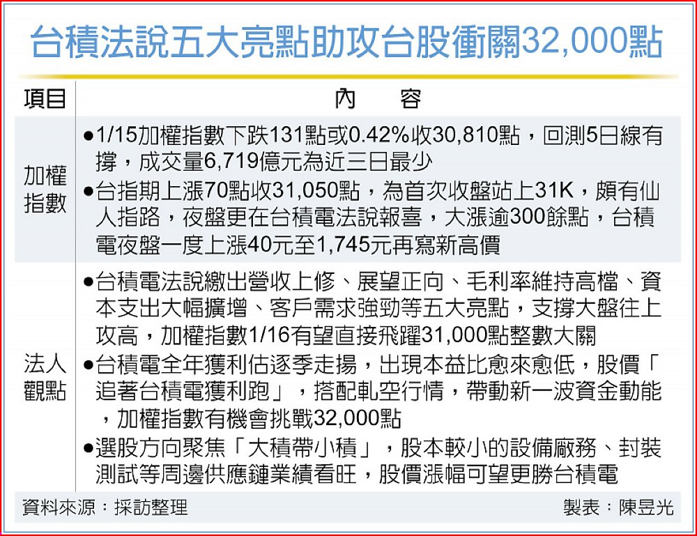 護國神山台積電法說內容亮眼,法人圈全面按讚,評點五大超預期,宣示AI仍將主導多頭地位,成為台股新一輪上攻動能,加權指數15日雖受觀望氣氛影響,呈現回檔整理走勢,但隨著法說行情點火、美232條款正向解讀的利多助攻,預估加權指數16日直接飛越31,000點整數大關,續創新高可期,劍指32,000點。
