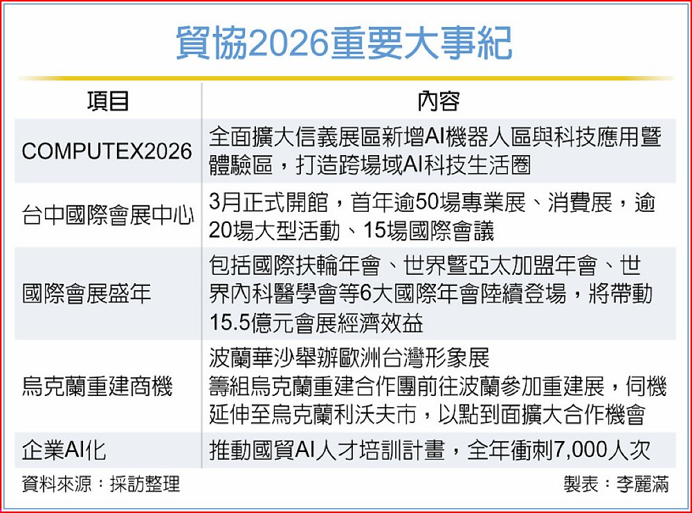 他同時預告,今年COMPUTEX重點在於AI與機器人,預計邀來科技界重量級人物出席,延續國際關注,展場除南港一、二館,並將新增世貿一館、台灣國際會議中心規劃AI與機器人專區及論壇,首度四館聯展盛況。