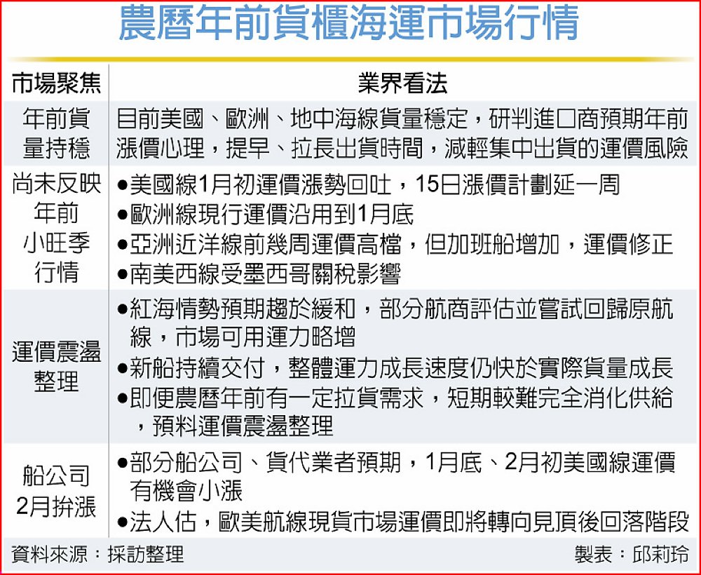 2026年傳統年前小旺季行情至今還沒發酵,業界研判,跟進口商提前拉貨,減輕年前集中出貨的運價風險,以及市場上運力寬鬆壓抑運價,大國角力關貿政策影響仍有變數,都有關係。