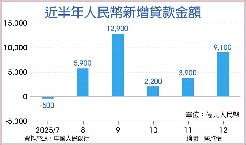 外媒根據中國人民銀行15日公布的數據計算,銀行業2025年12月新增人民幣貸款9,080億元,高於經濟學家預期的8,000億元。全年來看,2025年新增貸款總額16.27兆元,低於2024年的18.09兆元,已連續兩年下降。社會融資規模12月增加2.2兆元,略高於市場中位數預測的1.9兆元,顯示整體信貸供給仍低迷,企業與居民借貸意願有限。