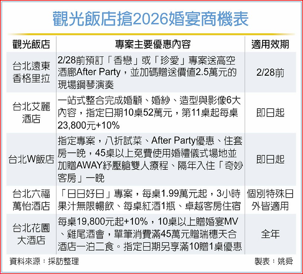 少子化、不婚人口增加衝擊婚宴市場,加上新飯店持續增加分食商機,包括台北遠東香格里拉、艾麗酒店、W飯店等飯店業者,新年開始便啟動「搶婚大戰」,推多元婚宴方案、主題婚宴、增加婚宴標配等方案外,更提供試菜打折、保證桌數更具彈性、下修離峰時間起桌價、消費滿額加贈住房與After Party婚後派對等眾多優惠,向新人招手。