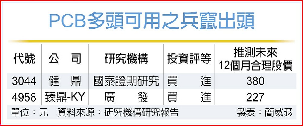 PCB族群強勢股持續冒出頭,內外資研究機構挑選可用之兵一點沒煩惱。廣發證券指出,臻鼎-KY(4958)擁抱AI與CoWoP,為被低估的產業巨人,初評「買進」、推測合理股價227元;國泰證期研究則看好健鼎(3044)受惠於需求大幅攀升,將推測合理股價調高至380元。