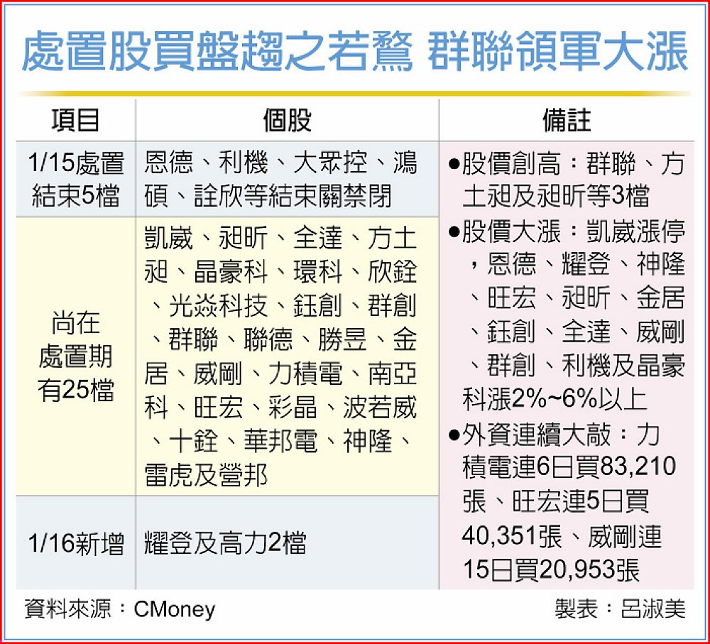 處置股人氣旺,股價強強滾,市場諷為「報明牌」,群聯、方土昶及昶昕等3檔個股15日股價均寫下歷史新高,另凱崴漲停,神隆、旺宏、金居、鈺創、全達、威剛、群創、晶豪科漲2%~6%以上。