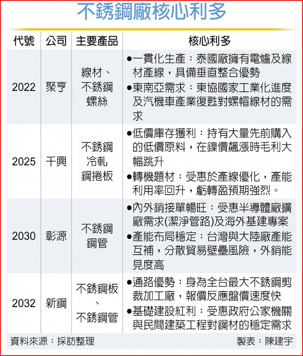 自2025年底以來,國際鎳價出現「史詩級」狂飆,上游鋼廠1月盤價也強勢調漲,台股鋼鐵族群15日由不銹鋼大軍領頭吹響反攻號角,指標股千興(2025)、彰源(2030)、新鋼(2032)、聚亨(2022)等盤中亮燈漲停,帶動不銹鋼板材、管材及線材廠全線走強,成為台股今日最吸睛的盤面亮點。