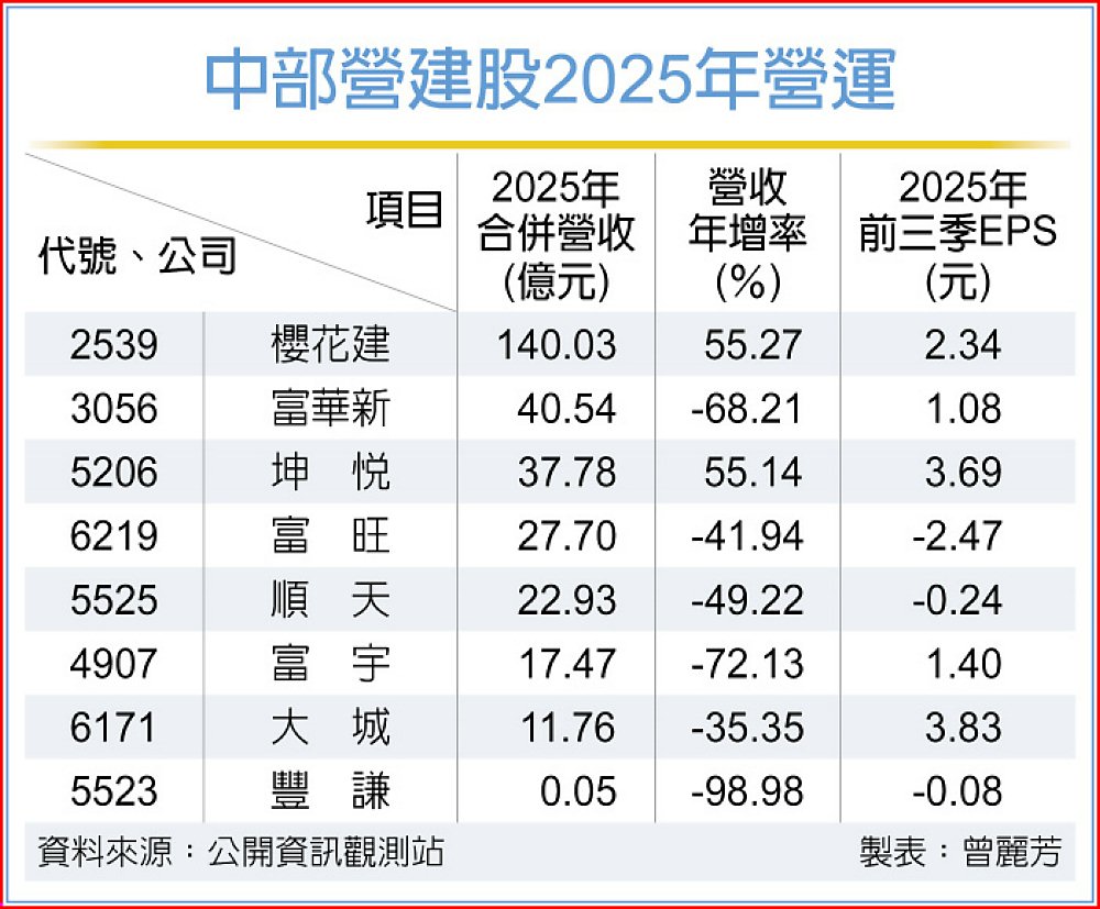 相較之下,部分中部建商因缺乏新案交屋,2025年營收出現明顯回落,富華新(3056)、大城(6171)2025年營收分別年減近7成與逾3成;順天(5525)、富旺(6219)雖12月一口氣認列大筆營收,惟2025全年營收仍幾乎較2024年腰斬。