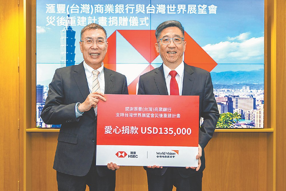 去年數起強颱、豪雨與複合型災害重創台灣多處地區,滙豐(台灣)商銀以實際行動支持受災社區復原,陪伴災民重建家園,宣布投入13.5萬美元專款,支持台灣世界展望會針對丹娜絲風災、花蓮馬太鞍堰塞湖溢流事件及鳳凰颱風等天災,進行災害重建計畫。滙豐(台灣)商銀總經理暨環球銀行業務主管陳志堅與台灣世界展望會董事長林啓峰,日前共同出席捐贈儀式。