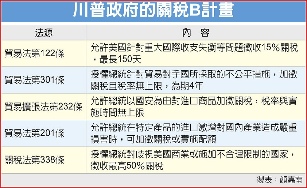 哈塞特的10%關稅可能是援引1974年貿易法第122條,允許白宮徵收15%關稅來解決貿易收支失衡問題。不過該法案的課稅時間最長只有150天,接下來川普政府可能依據第232條或第301條徵收關稅,前者針對特定產業,後者可針對特定國家是否歧視美國出口進行調查。