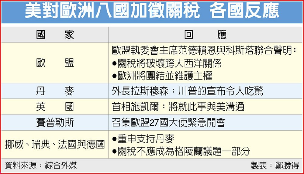 面臨川普關稅威脅的歐洲八國支持丹麥並同聲警告,美國若以武力強占北約領土,可能導致這個由華府領導的軍事聯盟瓦解。許多歐洲官員認為,川普真正意圖是擴張領土,而非安全考量。