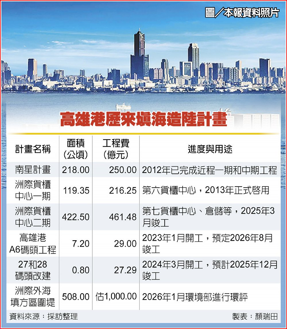 相關人士指出,過去填海造陸每公頃的費用不到1億元,目前已增至約1.6億元,高雄港洲際外海填方區圍堤造地計畫光以面積508公頃推估,總經費大約1,000億元。
