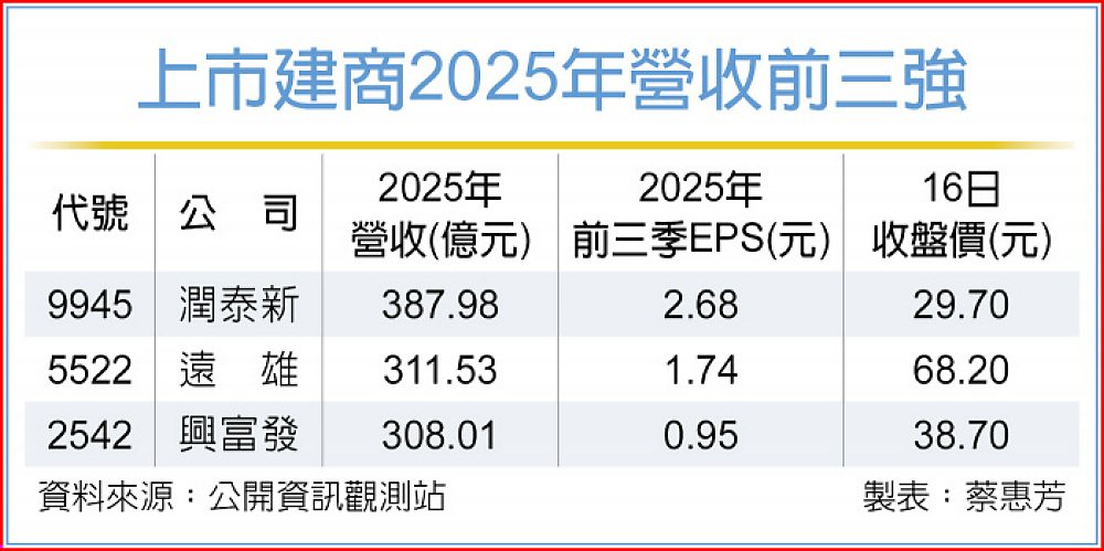 受惠交屋潮來臨,三大上市建商潤泰新(9945)、遠雄(5522)、興富發(2542),2025年業績衝鋒,躋身「營收300億元」俱樂部。三雄持續受惠於建案交屋入帳,以及部分新案跨年度認列,市場樂觀2026年可望仍是個豐收年。