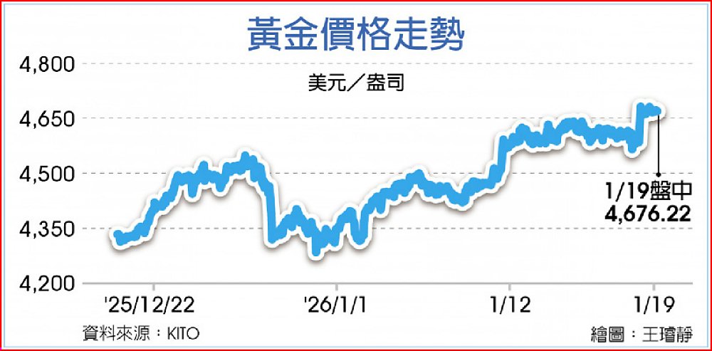 美國總統川普就格陵蘭島議題再向歐洲揮出關稅大棒,令投資人感到不安,19日市場避險情緒再度升溫,現貨黃金一度飆至每盎司4,690.59美元的歷史高點,距離4,700美元只有一步之遙,白銀價也觸及每盎司94.1213美元的新高。