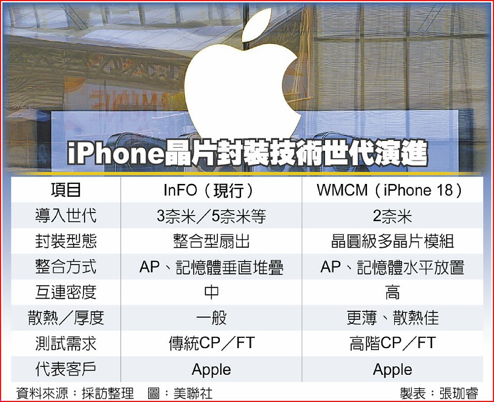 蘋果iPhone 18所採用的手機晶片,將正式跨入2奈米世代,封裝技術也同步升級,從現行的InFO(整合型扇出封裝),轉向更高階的WMCM(晶圓級多晶片模組封裝)。台積電除全力備戰2奈米量產產能外,供應鏈亦傳出,後段晶圓級測試(CP)與成品測試(FT),將由策略夥伴分工協力完成。法人分析,WMCM主要產能預料將集中於龍潭AP3廠區,其中日月光投控與精材具備先行布局與策略夥伴優勢。