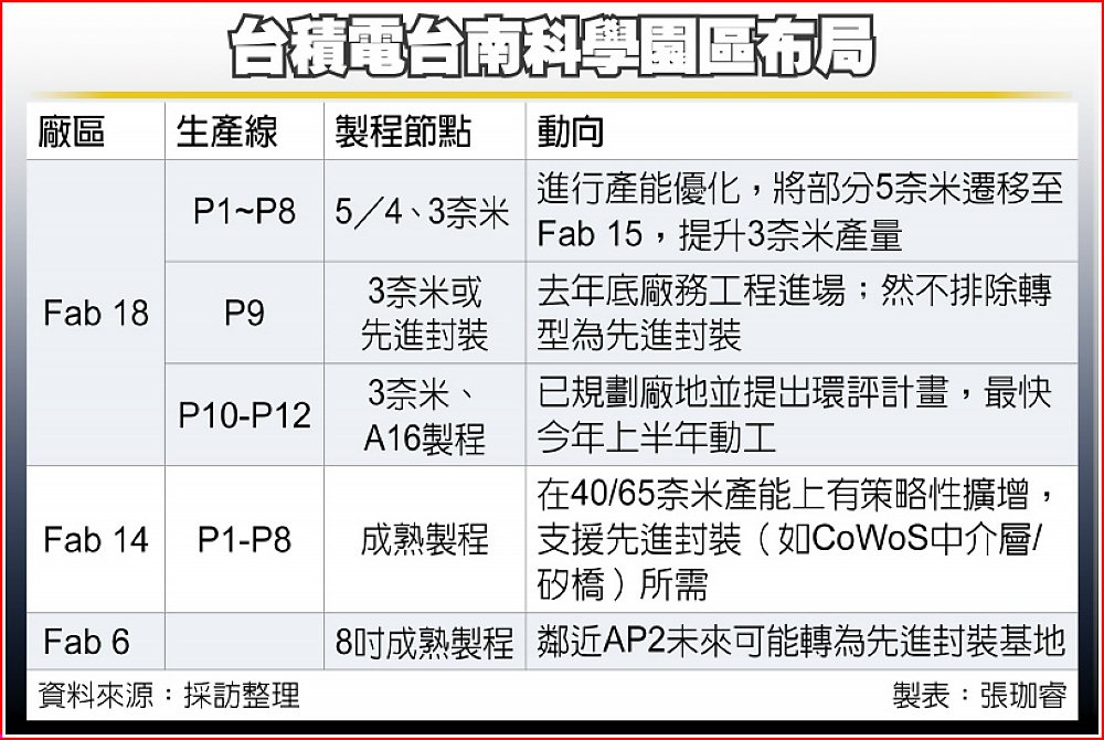 南科Fab 18一期至八期目前全面承擔N5與N3製程,產能利用率已趨近滿載。設備業者指出,台積電正快速進行產能調整、產線優化,如將Fab 18之N5設備轉調至台中Fab 15廠區,為客戶擠出更多3奈米產能;另一方面,P9則有機會轉作先進封裝廠,以利支撐未來龐大的光罩尺寸需求。