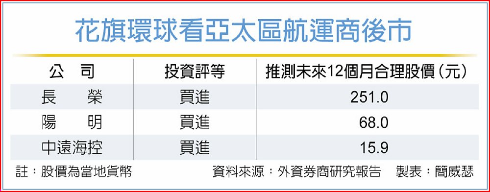 花旗環球證券指出,亞太區航商目前評價已反映悲觀預期,2026年預估股價淨值比僅約0.6~0.8倍,考量多數公司帳上維持淨現金水位,報酬風險比轉偏正向,將陽明投資評等從「賣出」跳升至「買進」,並維持長榮為族群投資首選,給予「買進」投資評等。