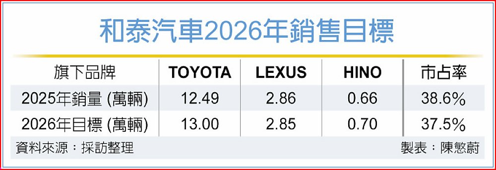 車業龍頭和泰汽車2026年車市展望出爐,隨全球景氣回穩、半導體與AI產業帶動出口成長,加上貨物稅補助政策延續與需求回補推升買氣,和泰車樂觀2026年台灣車市規模上看44萬輛。隨車市看好,和泰車代理的TOYOTA、LEXUS、HINO三品牌全年業績目標全面調高,合計新車銷量要挑戰16.5萬輛新高。