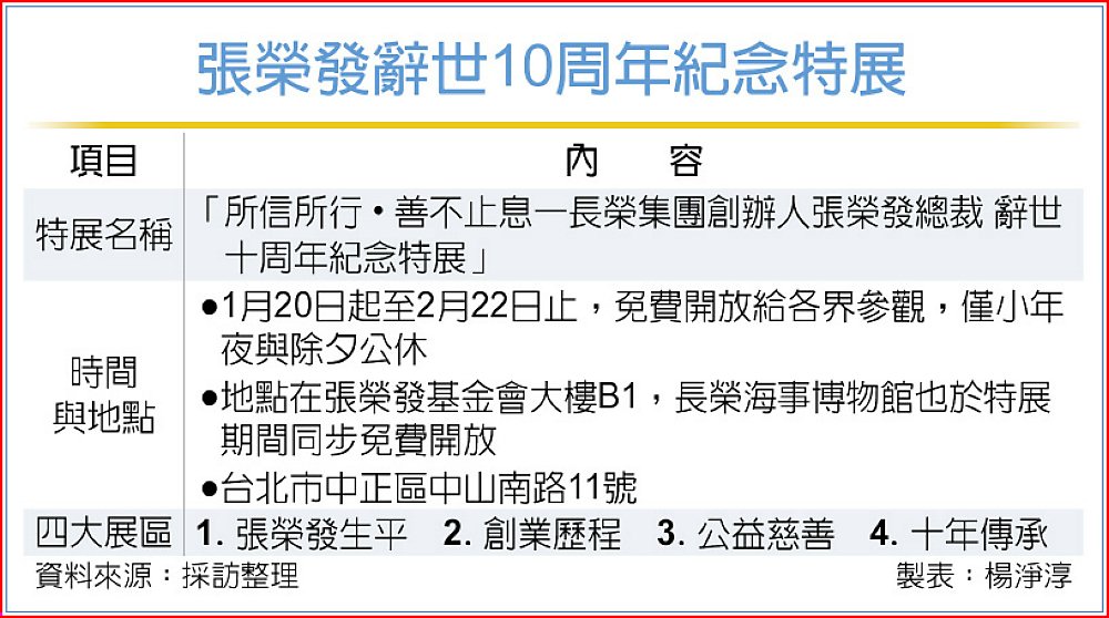 全球航運界巨擘、長榮集團創辦人暨總裁張榮發辭世滿10周年,張榮發基金會與長榮集團攜手於20日起展開「所信所行‧善不止息─長榮集團創辦人張榮發總裁 辭世十周年紀念特展」。集團與基金會在張榮發辭世後的近十年間,仍延續其精神,基金會在近十年持續資助出超過40億元資金、1985年成立以來更是累計資助超過百億元的公益資金。